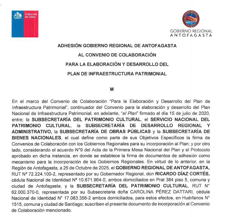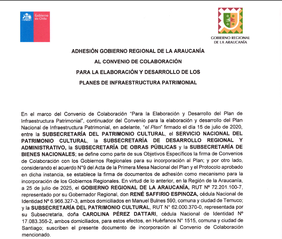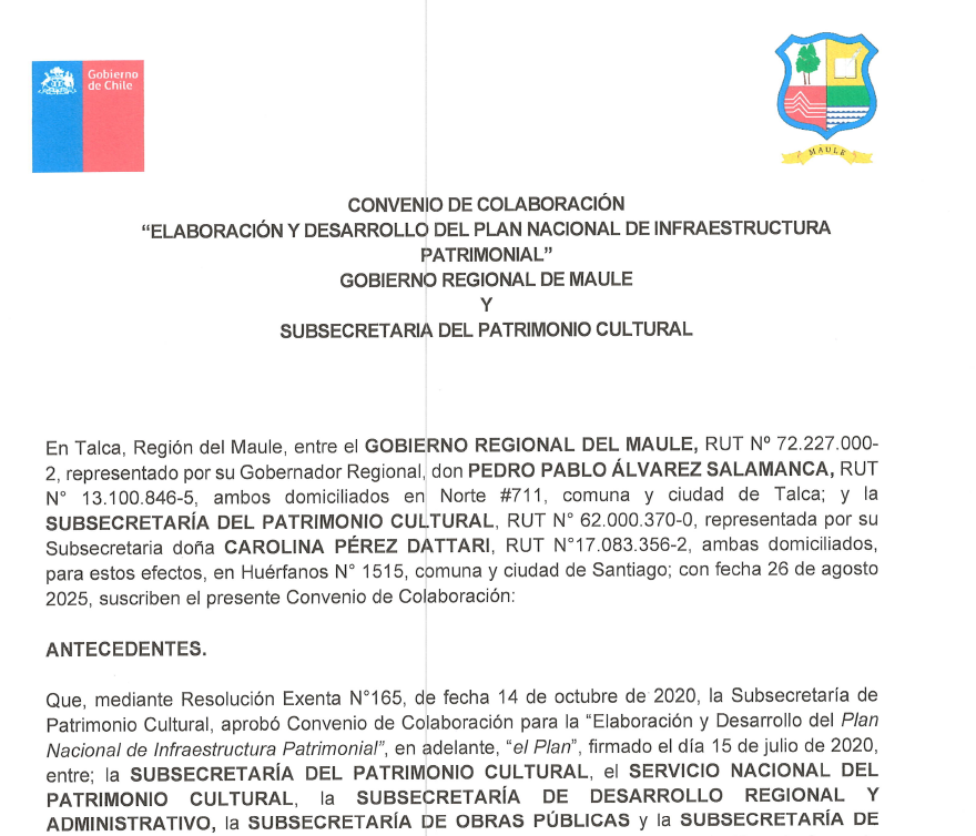 El Plan de Infraestructura Patrimonial es la materialización del convenio de colaboración entre las Subsecretarías del Patrimonio Cultural, de Obras Públicas, de Bienes Nacionales, de Evaluación Social y de Desarrollo Regional y Administrativo, junto con el Servicio Nacional del Patrimonio Cultural.